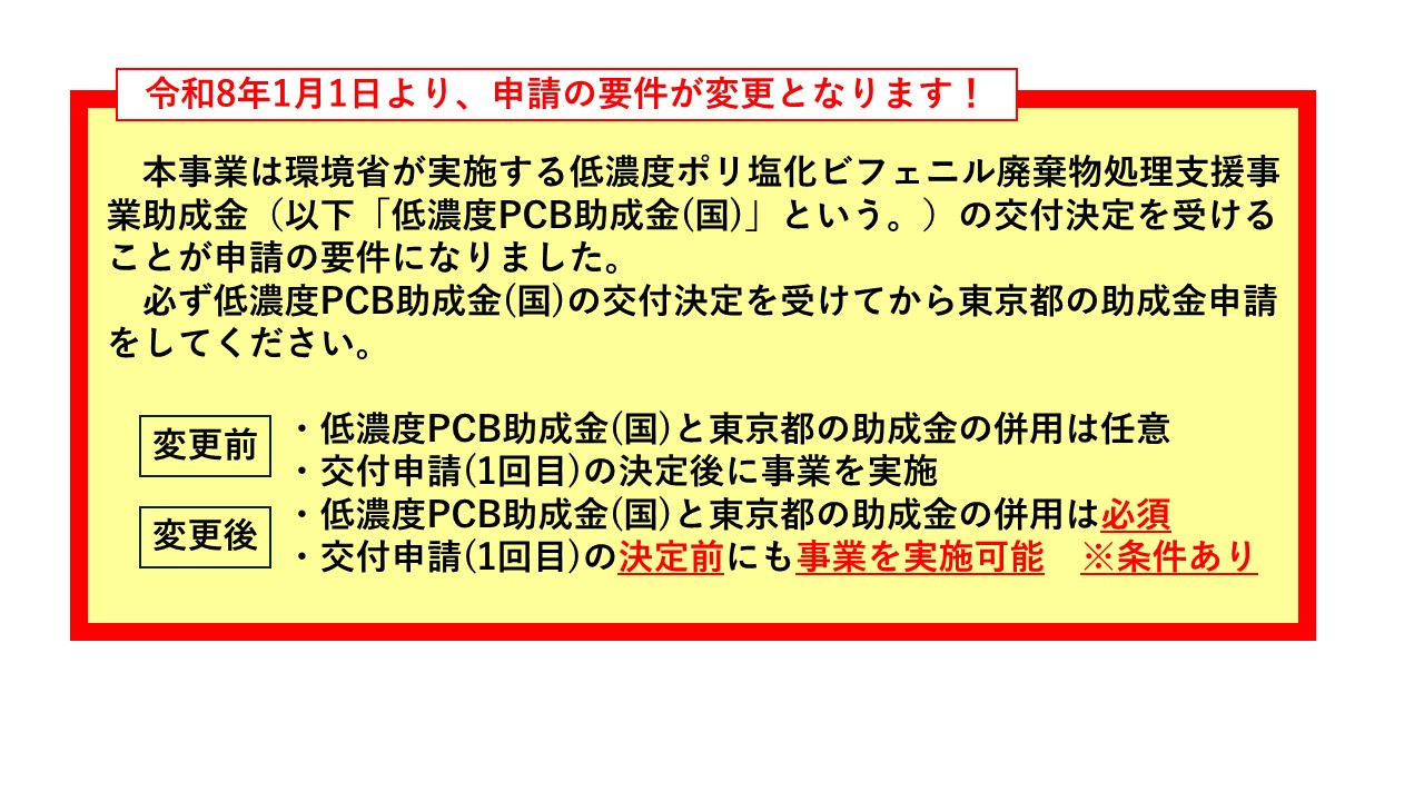 令和8年1月1日より、東京都微量PCB廃棄物処理支援事業について、以下の通り改正します。