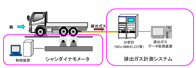 自動車排出ガス計測設備はシャシダイナモメータと排出ガス計測システムに分けられます。