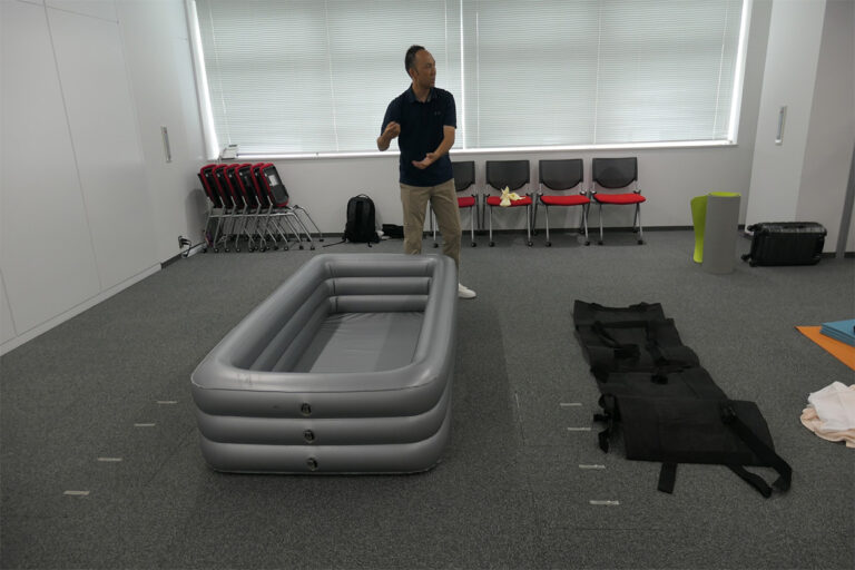 アイスバスに人の力だけで入れるのはとても大変なので、水に浮かないタンカ(メッシュ生地)を使うことで、少し簡単に運べるようになります。