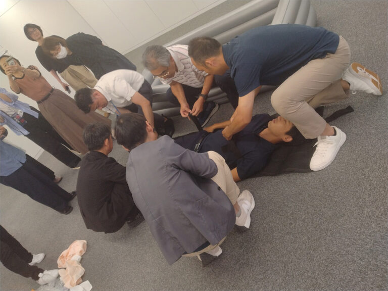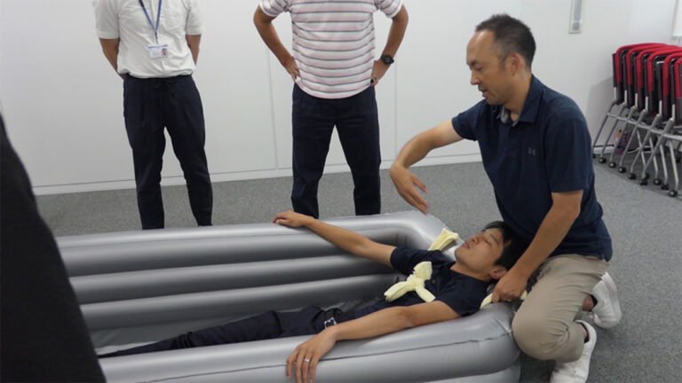 講座では、大人の男性1人を熱中症患者に見立て、5名の男性でアイスバスに入れる体験をしました。