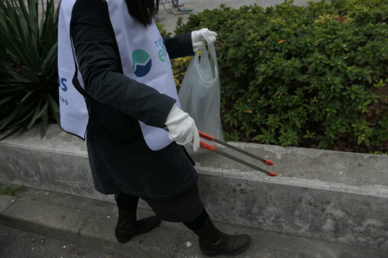 ガラスやたばこなどあぶない物があるかもしれないので、みんな軍手(ぐんて)をつけて、トングを使ってごみを拾いました。