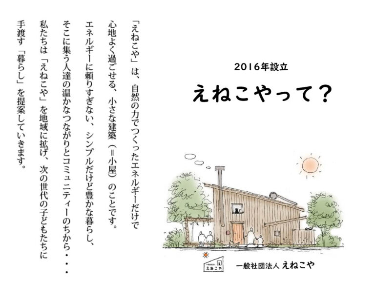 • 「えねこや」は、自然の力で作ったエネルギーだけで心地よく過ごせる建築(おウチなどの建物)のことを言います。