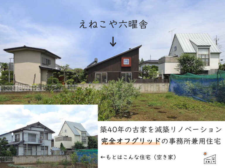 • 築40年超の古い家を減築(げんちく)したり、屋根に太陽熱温水器(たいようねつおんすいき)と太陽光パネルをつけたり、電気を蓄電池(ちくでんち)にためたりすることで、家のエネルギーをすべて自給自足(自分で作って自分で使う)する事務所and住宅として10年間使用しています。