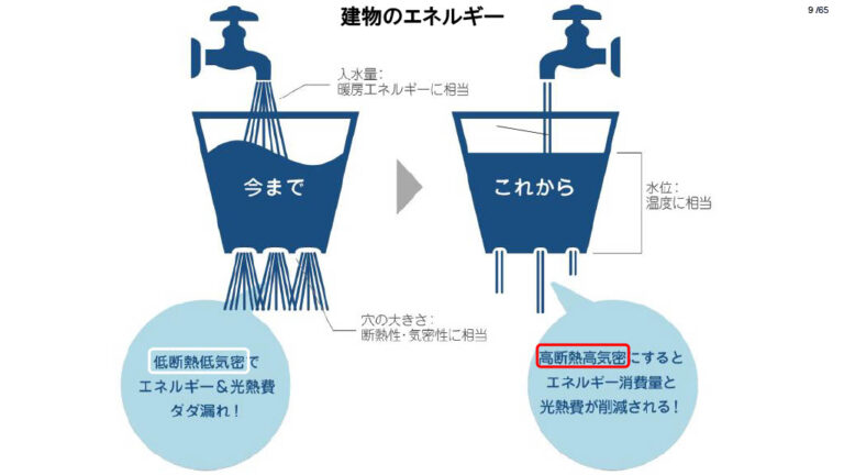 今の日本の家は、熱が出入りしやすいので、それをふさぐ「家の断熱(熱を断つ)・気密(外と内がつながっていない)性能を高くすること」が大切です。