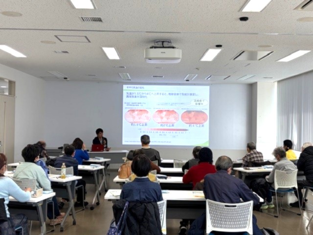 前半は、地球温暖化が引き起こす気候変動の現状と今後の予測について、データやグラフを用いて解説しました。参加者の皆さんは、近年の夏の気温上昇が深刻であることを改めて認識されたようです。後半は、猛暑が予想される今年の夏に向けて、春からできる暑熱順化などの熱中症対策を学習しました。